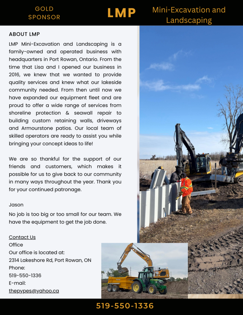LMP Mini Excavation and Landscaping is a family-owned and operated business with headquarters in Port Rowan, Ontario. From the time that Lisa and I opened our business in 2016, we knew that we wanted to provide quality services and knew what our lakeside community needed. From then until now we have expanded our equipment fleet and are proud to offer a wide range of services from shoreline protection & seawall repair to building custom retaining walls, driveways and Armourstone patios. Our local team of skilled operators are ready to assist you while bringing your concept ideas to life!